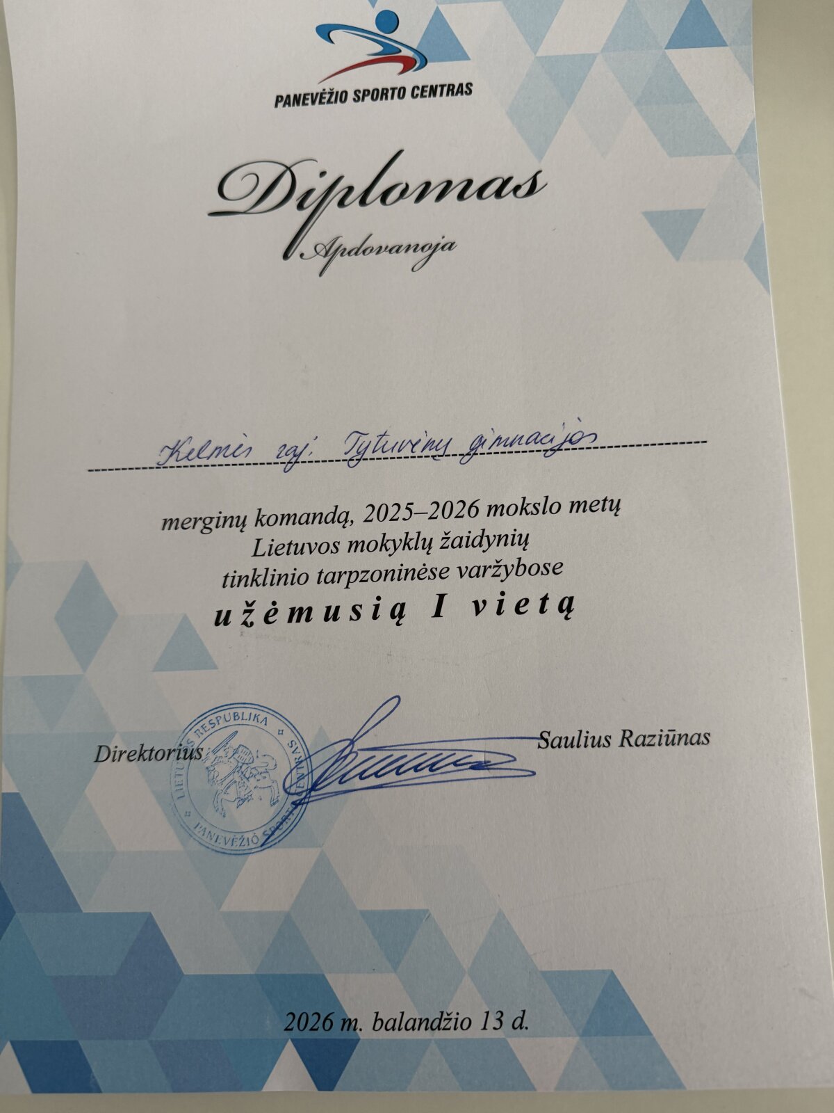 2026 m. balandžio 13 d. vykusiose 2025–2026 m. m. Lietuvos mokyklų žaidynių didžiųjų mokyklų merginų tinklinio (gim. 2009 m.) tarpzoninėse varžybose mūsų komanda iškovojo I vietą.