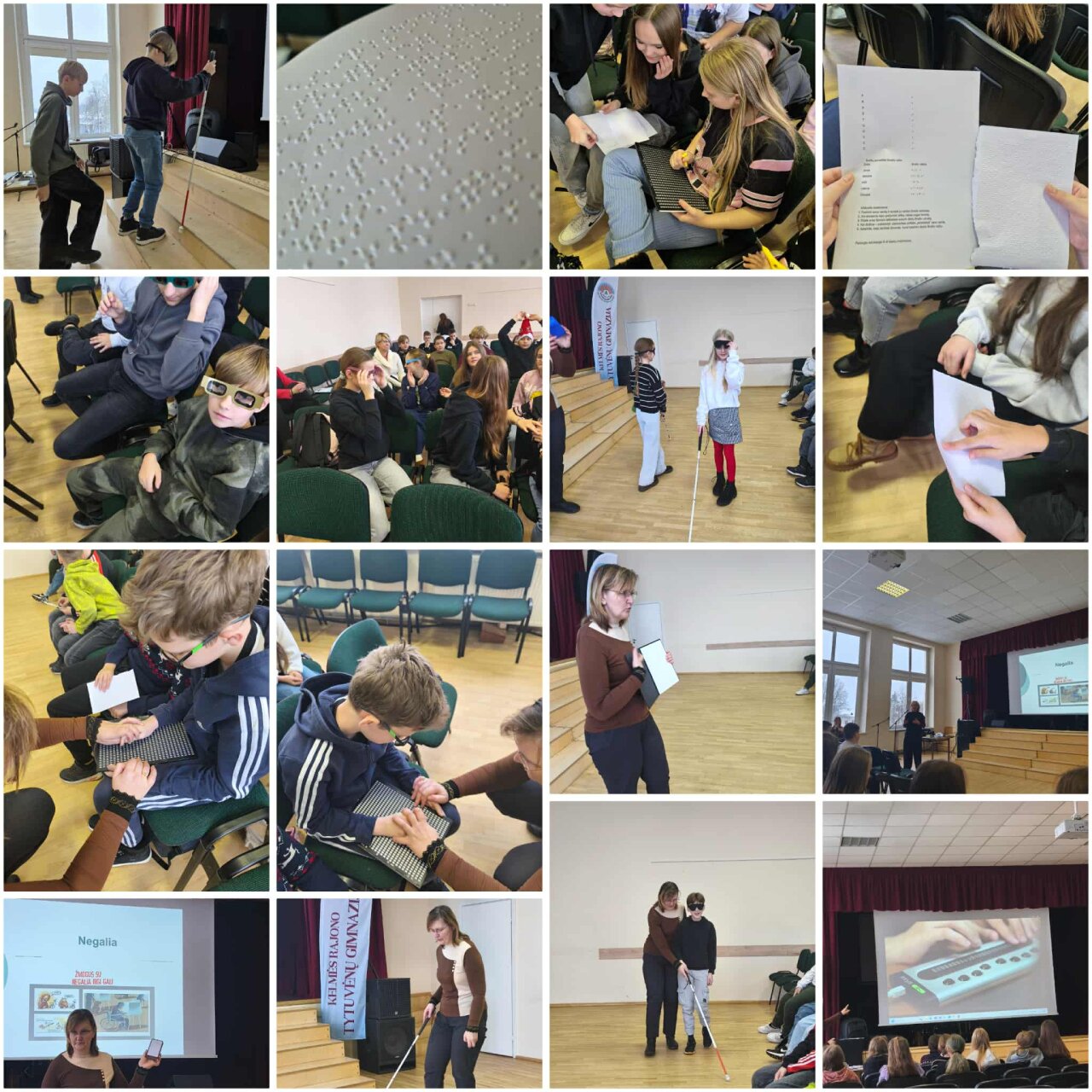 Viešnia papasakojo, kaip keičiasi pasaulis netekus regos, kokį svarbų vaidmenį atlieka Baltosios lazdelės naudojimas, padedantis orientuotis aplinkoje, bei kaip regos negalią turintys žmonės mokosi ir skaito naudodami Brailio raštą. Mokiniai turėjo galimybę pamatyti ir išbandyti įvairias pagalbines priemones – specialiuosius didintuvus, garsinius įrenginius, taktilines priemones, kurios palengvina kasdienybę ir leidžia būti savarankiškiems.