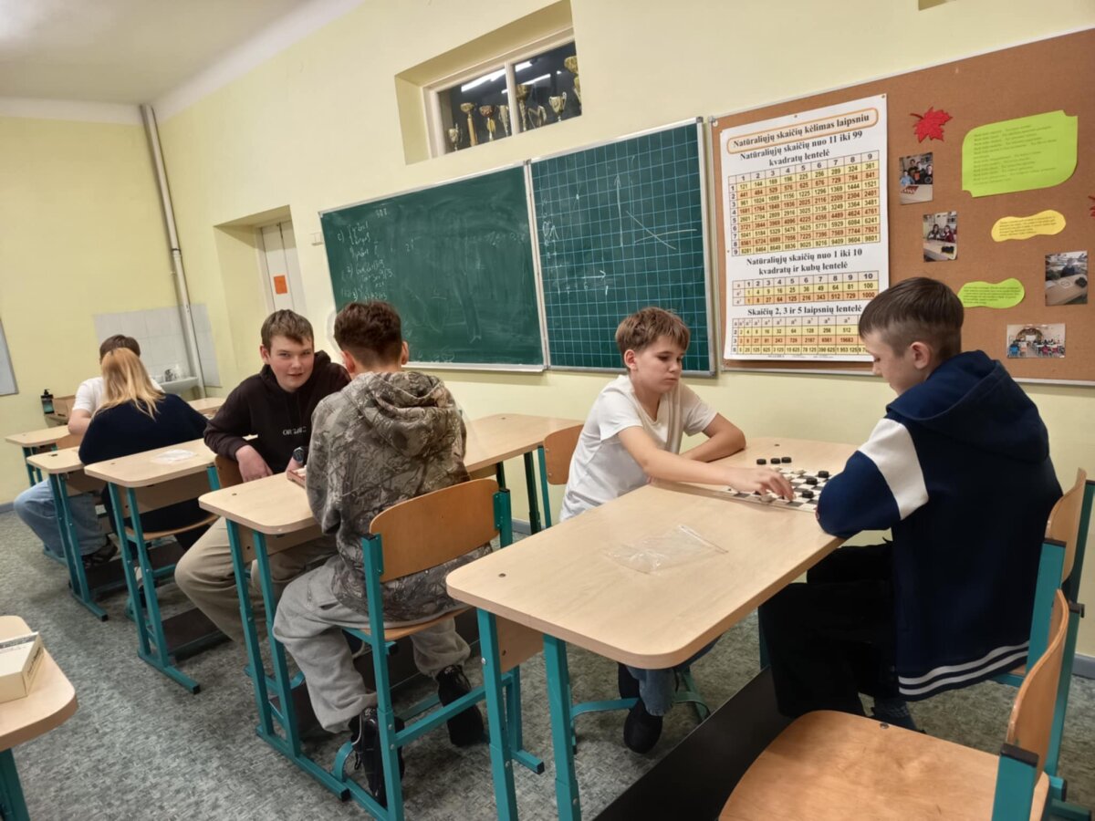 Gruodžio 3 dieną vyko 7-8 klasių mokinių komandinės šaškių varžybos. Nė vieno pralaimėjimo nepatyrė šie mokiniai: Bekerytė D. (7a kl.), Milašius J. (8 kl.), Makaras B. (8 kl.). Šaškių varžybas laimėjo 8 klasės mokiniai: Kizis E., Milašius J., Kondrotaitė I., Makaras B.