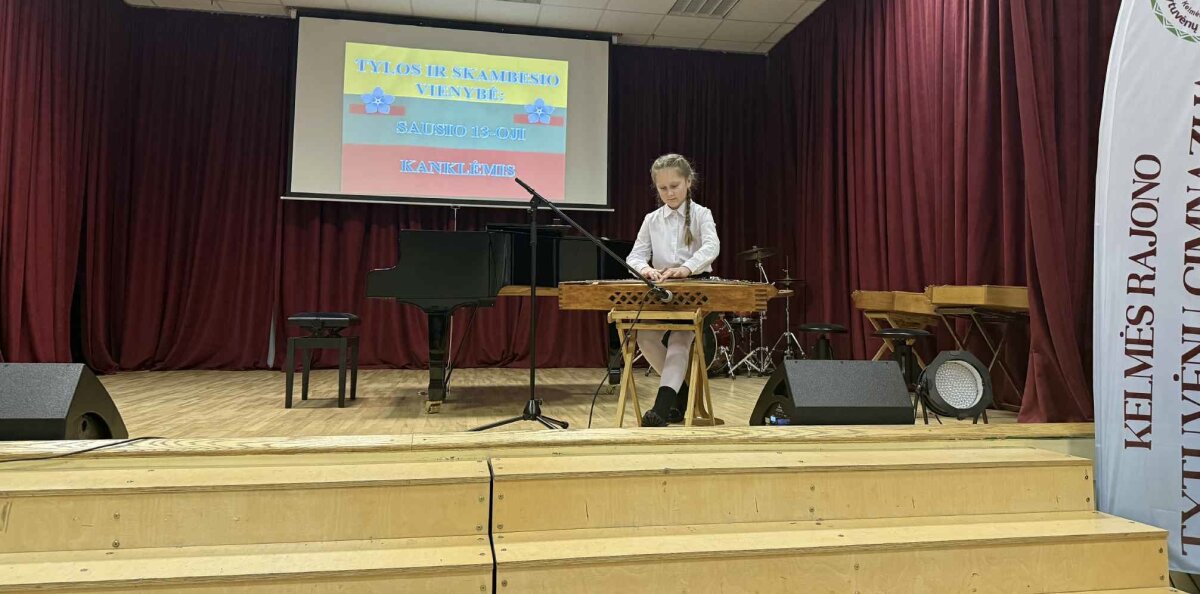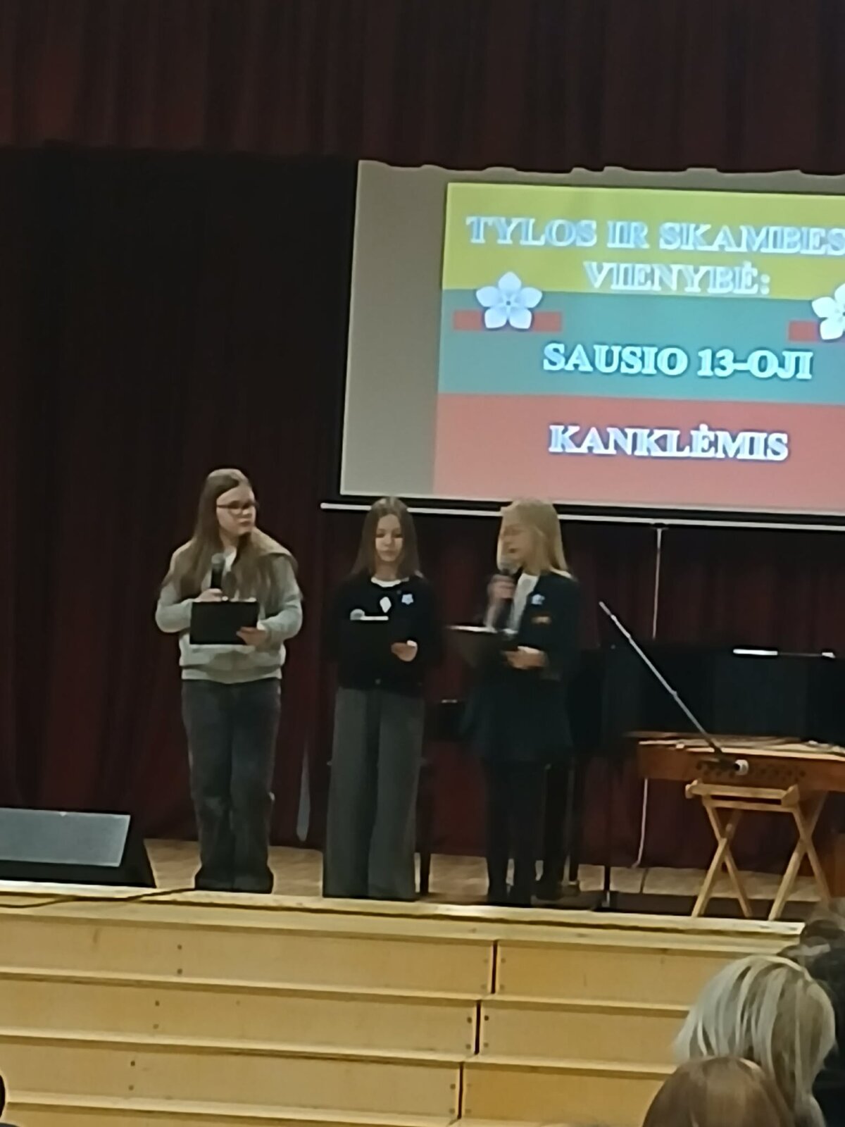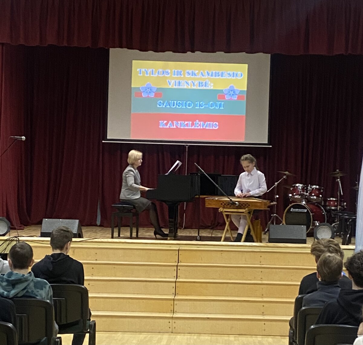 Po pilietinės iniciatyvos 4–8, I g klasių mokiniai rinkosi į salę, kur vyko minėjimas „Tylos ir skambesio vienybė: Sausio 13-oji kanklėmis“. Istorijos mokytojas Evaldas Butkus skaitė pranešimą apie Sausio 13-osios įvykius, primindamas lemtingas kovas už Lietuvos laisvę. Muzikos mokytojos Linos Baranauskienės mokiniai kanklių skambesiu kūrė jautrią ir prasmingą atmosferą, o mokytojų Angėlės Ševeliovaitės ir Vitalijos Šilerienės mokiniai deklamavo eiles, skirtas Laisvės gynėjų atminimui.