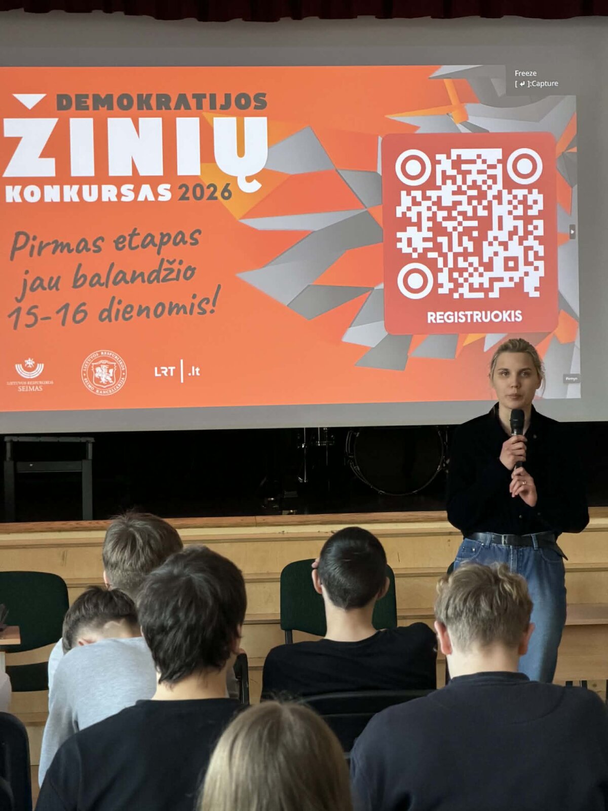 2026 m. vasario 26 d. 8 - I g klasių mokiniai dalyvavo Demokratijos žinių konkurso pilietiškumo pamokoje, kurią vedė Seimo kanceliarijos darbuotojos: Informacijos ir komunikacijos departamento Seimo lankytojų centro biuro vyriausioji specialistė Ugnė Daukantaitė - Rudzinskienė ir Informacijos ir komunikacijos departamento Seimo lankytojų centro biuro vyriausioji specialistė Ingrida Česokė. Demokratijos žinių konkurso nugalėtojais tapo: Demokratijos žinių konkurso nugalėtojais gimnazijoje tapo: