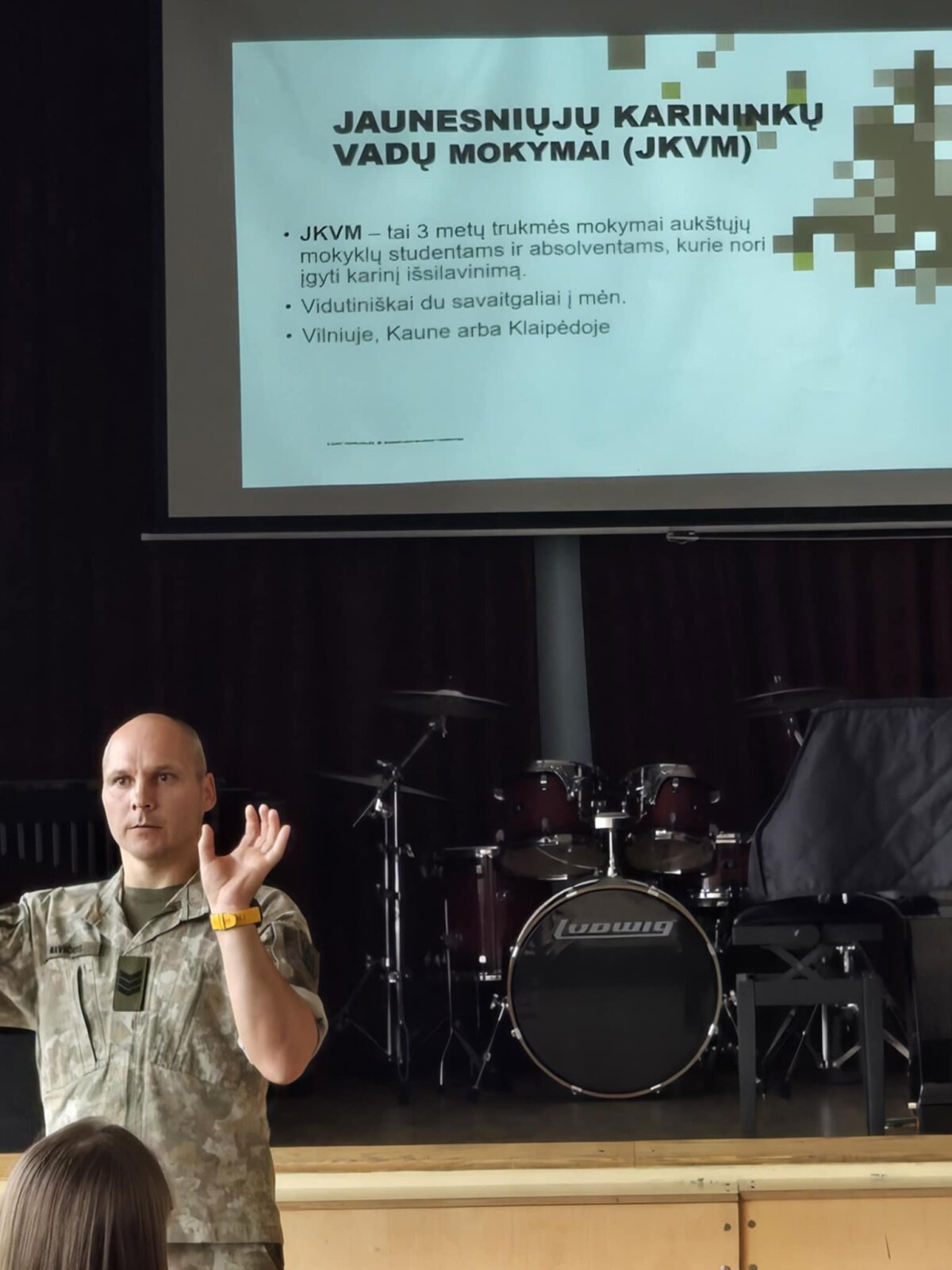 Savo pristatyme seržantas Arūnas Navickis aptarė kodėl verta rinktis 9 mėn. karinę tarnybą, kodėl verta tapti kariu savanoriu, kodėl verta stoti į Generolo Jono Žemaičio Lietuvos karo akademiją. Papasakojo apie jaunesniųjų karininkų vadų mokymus bei profesinę karo tarnybą ir reikalavimus kandidatams.