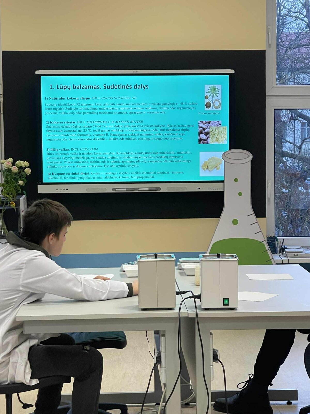 Lapkričio 14 d. II g klasių mokiniai Šiaulių STEAM centre atliko tiriamąjį darbą „Kūno odos priežiūros kosmetikos gamyba“. Užsiėmimo metu mokiniai išbandė kosmetikos gamybos procesą, įgijo praktinių žinių apie sudėtines medžiagas, jų savybes bei gamybos technologijas.