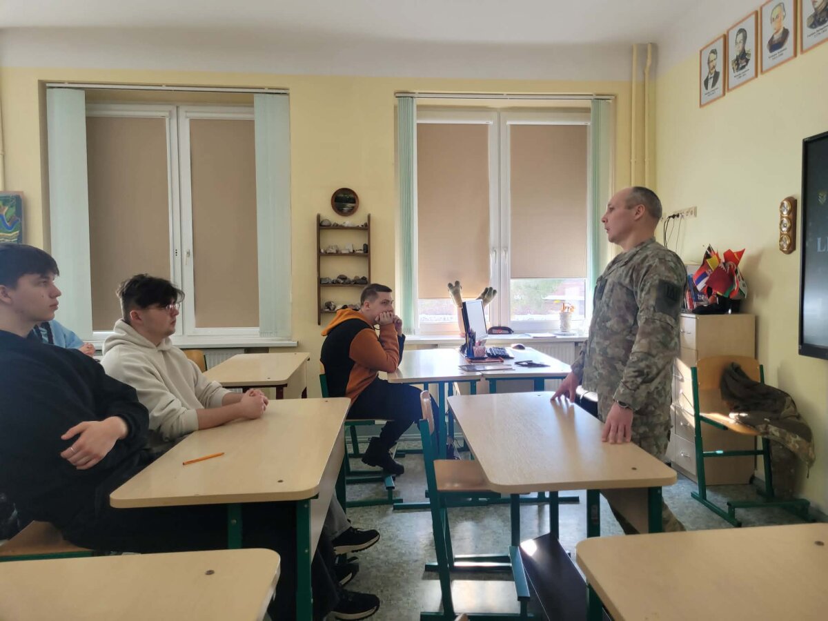 2026-02-26 Kelmės rajono Tytuvėnų gimnazijos III g klasės mokiniai susitiko su Šiaulių regioninės karo komendantūros vyresniuoju verbuotoju Arūnu Navickiu.